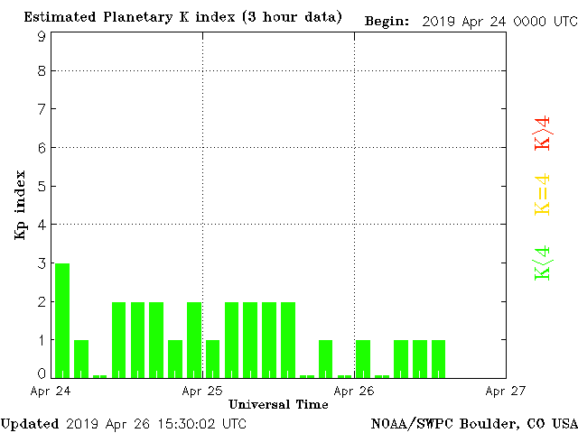 Geomagnetic activity is stable, ranging from 0 to 1 of the Kp Index. The solar wind intensity is calm. The expected coronal-hole stream should impact this weekend but without major effect. The next earth-facing coronal-hole stream will interact with the earth in several days.