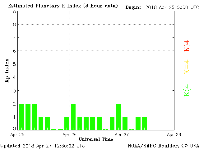 Geomagnetic activity is stable, ranging from 0 to 1 of the Kp Index. Solar wind intensity is calm. The next earth-facing coronal-hole is minor and won’t likely result in geomagnetic upticks of any significance.