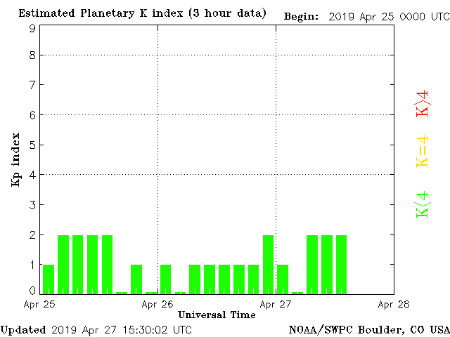 Geomagnetic activity is stable, ranging from 0 to 2 of the Kp Index. The solar wind intensity is calm. This morning, several shifts in directional polarity of the geomagnetic field caused minor disturbances. The next earth-facing coronal-hole stream will interact with the earth in several days.