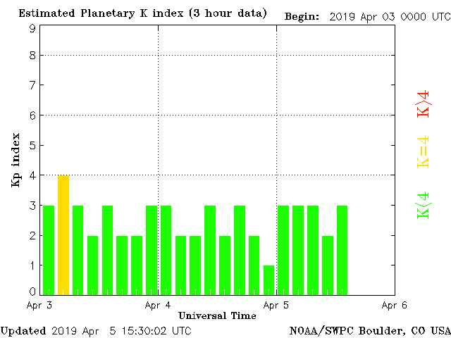 Geomagnetic activity is stable, ranging from 2 to 3 of the Kp Index. The solar wind intensity rose slightly but without substantial effect on the geomagnetic field. The next earth-facing coronal-hole stream will impact in 24 hours or so.
