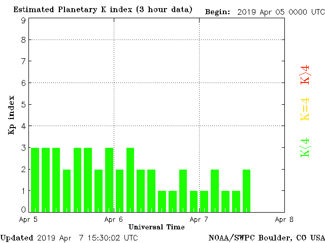 Geomagnetic activity is stable, ranging from 1 to 2 of the Kp Index. The solar wind intensity is calming and should remain so for several days. However, a sunspot group moved into the earth-facing position and is already starting to produce solar flares. Minor spikes in geomagnetic activity may occur if coronal mass ejections take place in the earth-facing direction.