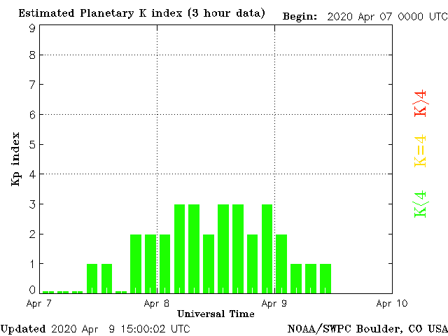 Geomagnetic activity is unstable, ranging from 1 to 3 of the Kp Index. The solar wind intensity is declining as the coronal-hole stream moves past the earth. Conditions should continue to calm as the next strong stream has yet to materialized.