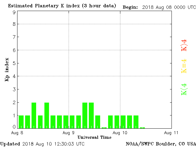 Geomagnetic activity is stable, ranging from 0 to 1 of Kp Index. Solar wind intensity is calming. The next earth-facing coronal hole will begin interacting with the earth some time next week.