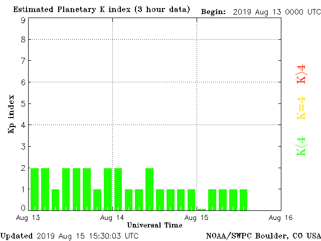 Geomagnetic activity is stable, ranging from 0 to 1 of the Kp Index. The intensity of the solar wind is trending down despite a series of weak coronal-hole stream impacts. For the next four days, several weak solar-wind streams will impact the earth, however, the geomagnetic field has already adjusted.