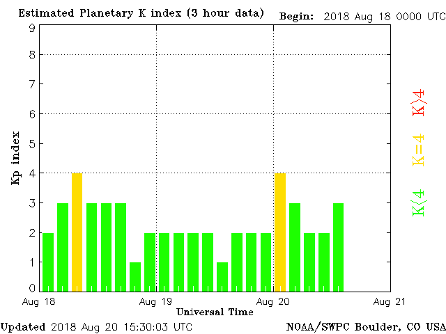 Geomagnetic activity is unstable, ranging from 3 to 4 of Kp Index. Solar wind intensity spiked over the weekend, hitting 700 km/s. Geomagnetic upticks took place last night in response to the solar wind intensification, which itself appears to be reducing in speed. Secondary upticks of the geomagnetic field are likely to occur throughout the next 24 hours.