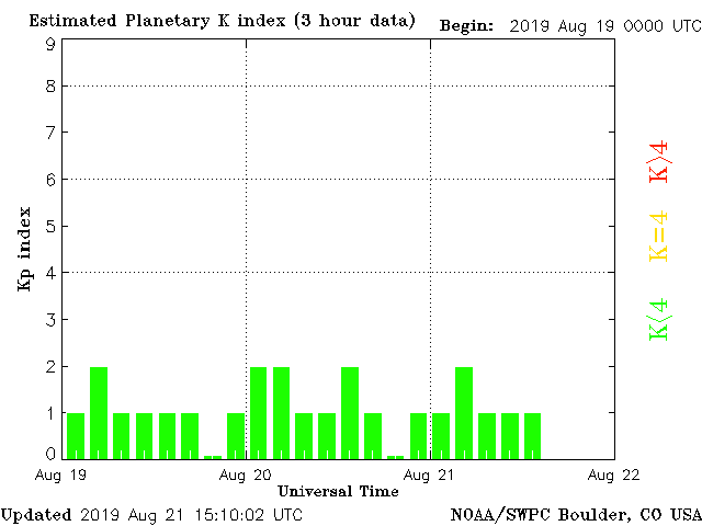 Geomagnetic activity is stable, ranging from 1 to 2 of the Kp Index. The intensity of the solar wind is calm, despite a seemingly erratic appearance due to instrumentation glitches. The solar wind is already weakening as the narrowband coronal-hole stream is moving away from the earth. Calm conditions are likely until early next week.