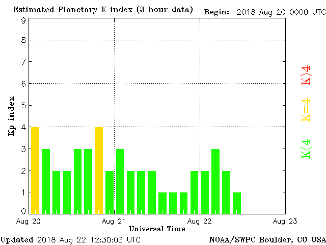 Geomagnetic activity is stabilizing, ranging from 1 to 3 of Kp Index. Solar wind intensity is almost at normal levels. Geomagnetic upticks are unlikely until the next coronal hole stream impacts the earth in a day or so.