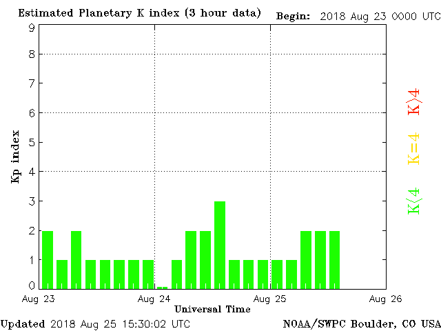 Geomagnetic activity is somewhat unstable, ranging from 1 to 2 of Kp Index. Solar wind intensity spiked last night. Geomagnetic upticks are not expected beyond the minor range due to lack of strong solar wind intensity.