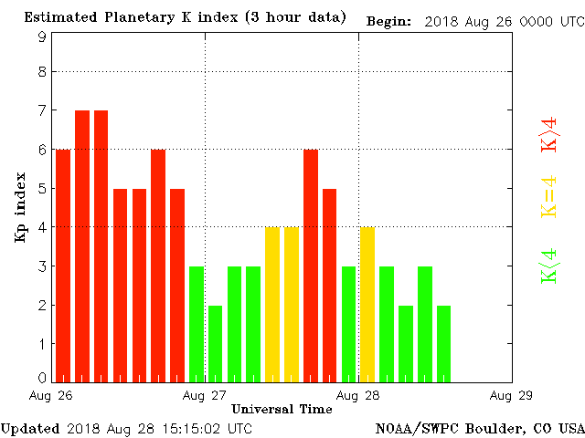 Geomagnetic activity is stabilizing, ranging from 2 to 3 of the Kp Index. Solar wind intensity continues to diminish. Secondary upticks of geomagnetic activity occurred yesterday but conditions should continue to stabilize over the next 24 hours. The next earth-facing coronal hole stream is less strong and will impact the earth in several days.