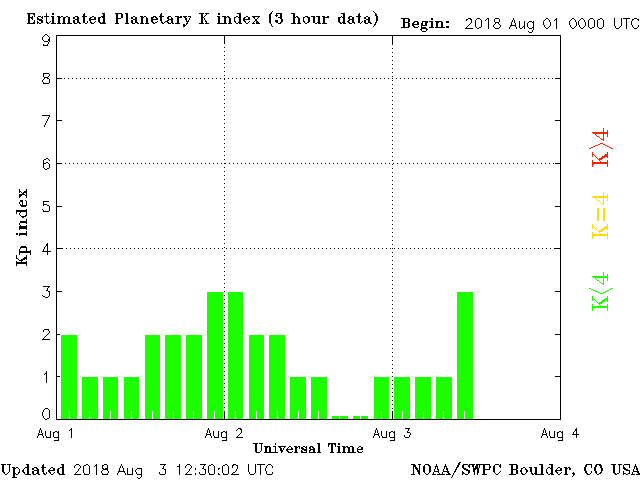Geomagnetic activity is stable, ranging from 1 to 3 of Kp Index. Solar wind intensity is returning to calm for now. The coronal hole stream will impact tonight or tomorrow, causing minor upticks in geomagnetic activity.