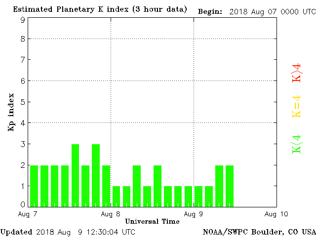 Geomagnetic activity is stablizing, ranging from 1 to 2 of Kp Index. Solar wind intensity increased but is calming. The next earth-facing coronal hole will begin interacting with the earth in several days.