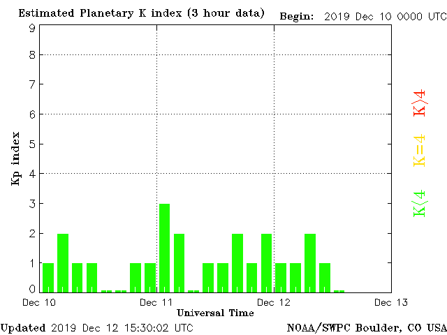 Geomagnetic activity is somewhat stable, ranging from 0 to 2 of the Kp Index. The solar wind intensity continues to slowly decline. The second solar wind stream predicted for today should actually arrive tomorrow, expected to produce geomagnetic disturbances.