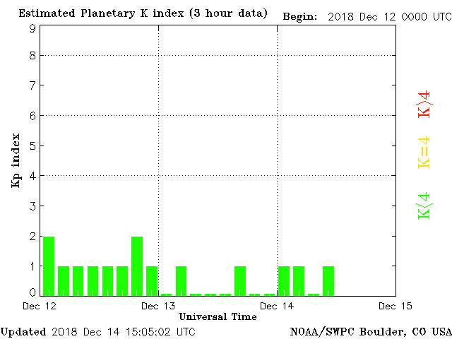 Geomagnetic activity is stabile, ranging from 0 to 1 of the Kp Index. Solar wind intensity is calm. The next earth-facing coronal hole stream is expected to impact the earth in a day or so.