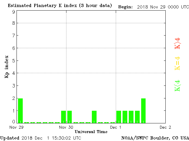 Geomagnetic activity is stabile, ranging from 1 to 2 of the Kp Index. Solar wind intensity is currently weak, but expected to increase in the next day. A minor geomagnetic event is currently taking place, due to a phi angle shift in the geomagnetic field. The earth-facing coronal hole stream is expected to impact in 24 hours or so.