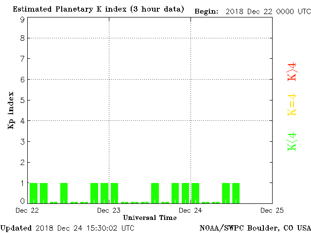 Geomagnetic activity is stable, ranging from 0 to 1 of the Kp Index. Solar wind intensity is very calm. The next earth-facing coronal hole stream is expected to impact in several days.
