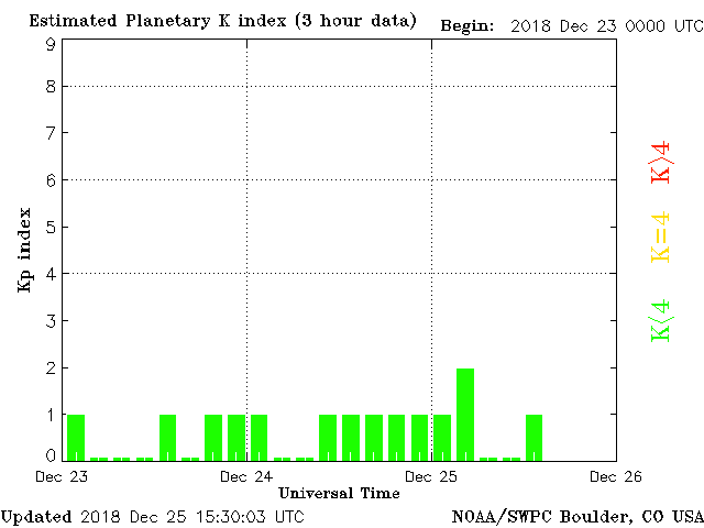 Geomagnetic activity is fairly stable, ranging from 0 to 1 of the Kp Index. Solar wind intensity spiked last night due to the earth-facing coronal hole stream. Strong geomagnetic storms are not expected.
