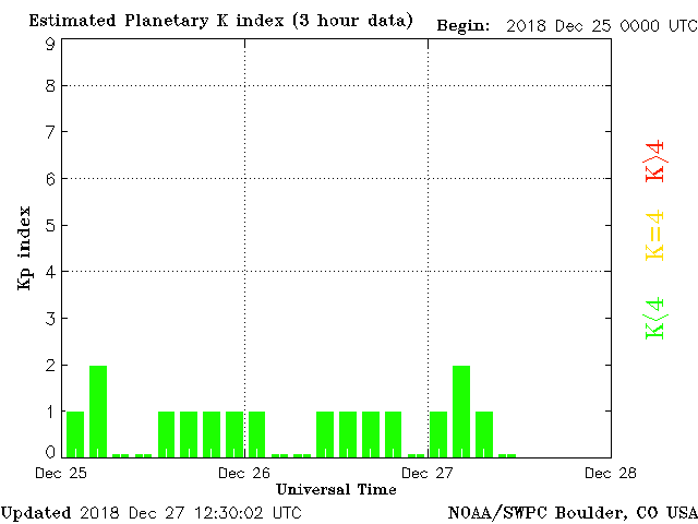 Geomagnetic activity is stable, ranging from 0 to 2 of the Kp Index. Solar wind intensity is normal. The next earth-facing coronal hole is expected to connect magnetically in 24 hours, resulting in some intensified geomagnetic activity about 24 hours thereafter.