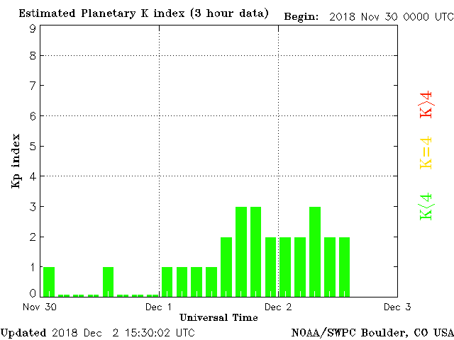 Geomagnetic activity is somewhat unstable, ranging from 2 to 3 of the Kp Index. Solar wind intensity is spiked slightly but is already trending back down. A minor geomagnetic event is currently taking place due to the solar wind activity. The next earth-facing coronal hole stream is expected to impact in several days.