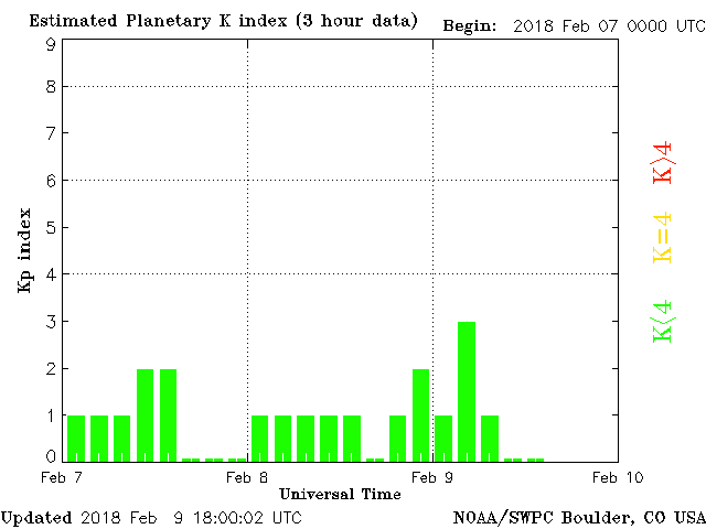 Geomagnetic conditions are highly stable, ranging from 0 to 1 of the KP index. A solar wind intensification resulted in a minor uptick of geomagnetic activity but conditions are now highly stable.