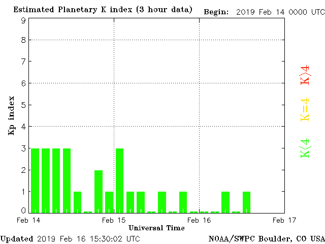 Geomagnetic activity is stable, ranging from 0 to 1 of the Kp Index. The solar wind intensity is calm. The next earth-facing coronal-hole will begin interacting with the earth in several days. Over the past week, the phi angle never shifted such that the coronal-hole stream could interact with the geomagnetic field. The next set of coronal-holes could cause that phi angle shift in 3 days or so.
