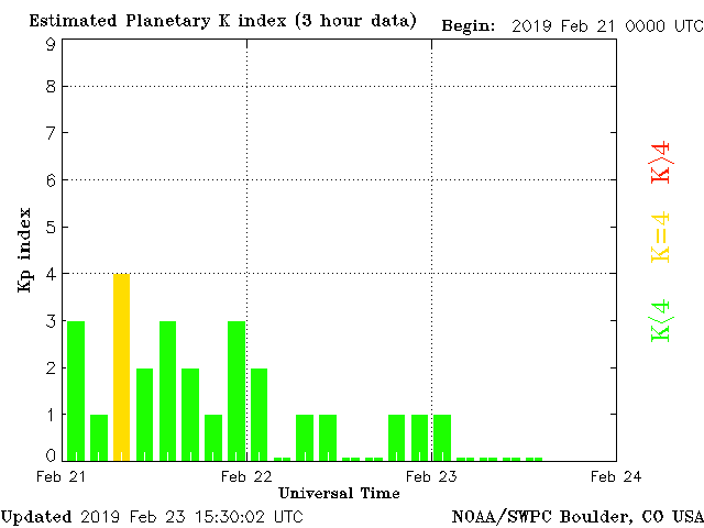 Geomagnetic activity is stable, ranging from 0 to 1 of the Kp Index. The solar wind intensity in returning to normal. No geomagnetic storms expected in the next 72 hours. The next coronal-hole stream will impact the earth in approximately 72 hours or so.