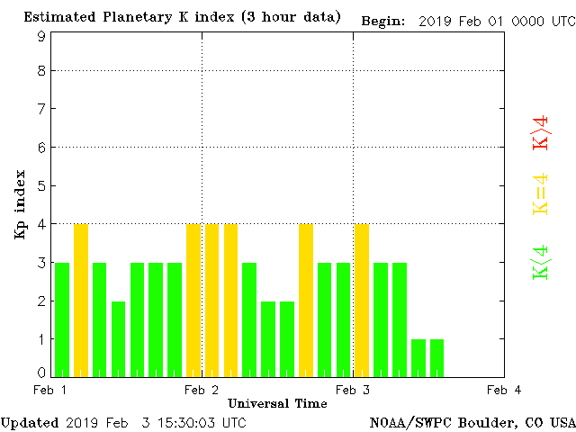 Geomagnetic activity is unstable, ranging from 1 to 3 of the Kp Index. The solar wind intensity is slowly calming down for now but a second coronal hole stream is expected to impact later today or tomorrow. Low level geomagnetic storms are possible over the next 24 to 48 hours.