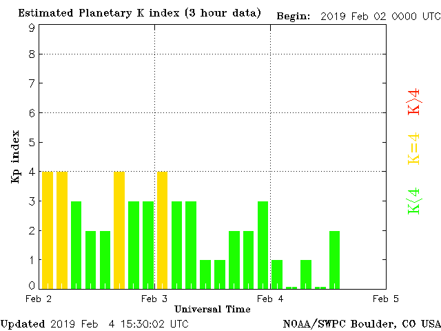 Geomagnetic activity is stabilizing, ranging from 0 to 2 of the Kp Index. The solar wind intensity has returned to calm conditions. Despite our predictions, we did not connect magnetically with the earth-facing coronal-hole yesterday. That connection could happen at any time and will likely result in minor disturbances of the geomagnetic field. Calm conditions should persist for the foreseeable future.