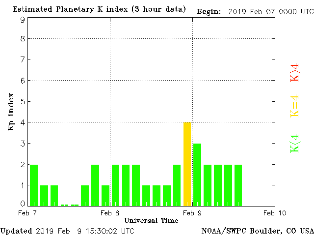 Geomagnetic activity is stable for now, steady at 2 of the Kp Index. The solar wind intensity spiked modestly last night as the coronal-hole stream finally made contact with the geomagnetic field. A minor disturbance occurred but with little effect. The field should continue to stablize throughout the day.