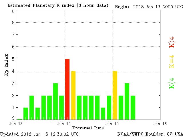 Geomagnetic conditions are stabilizing, ranging from 2 to 3 of the KP index. Another minor uptick in geomagnetic activity occurred early this morning, as the coronal-hole stream impacted earlier than expected.