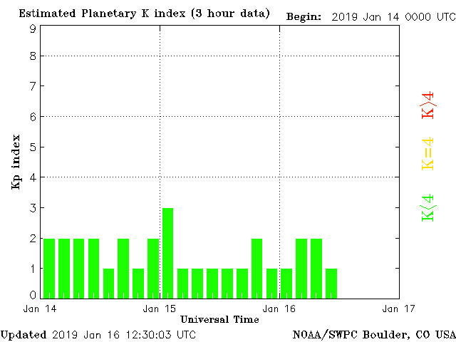 Geomagnetic activity is fairly stable, ranging from 1 to 2 of the Kp Index. Solar wind intensity is still trending down from a minor uptick a day ago. The next earth-facing coronal hole is expected to interact with the earth later today but with a very week stream