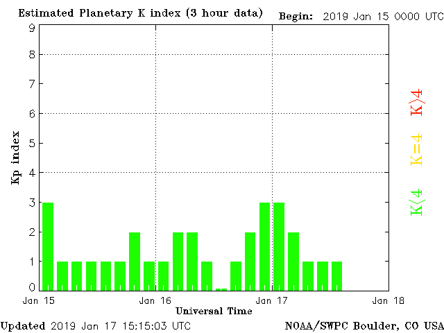 Geomagnetic activity is fairly stable, ranging from 1 to 3 of the Kp Index. Solar wind intensity spiked modestly today due to the coronal hole stream that finally arriving this morning. The stream is still intensifying, and could result in minor geomagnetic storms. For now, the geomagnetic field appears to have adjusted to the intensified stream and as such may produce only minor disturbances.
