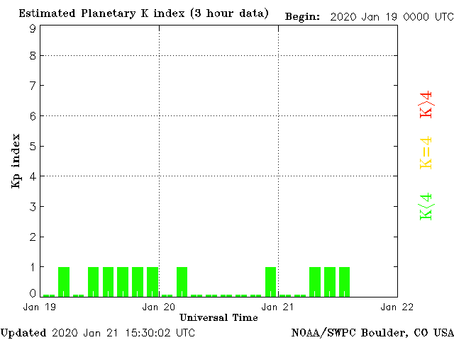 Geomagnetic activity is stable, ranging from 0 to 1 of the Kp Index. The solar wind intensity is rose slightly this morning, but not strong enough to cause any geomagnetic disturbances. The coronal-hole stream that was expected to impact for today, already predicted to be weak, has weakened considerably. The next uptick will be in several days, also predicted to be inconsequential.
