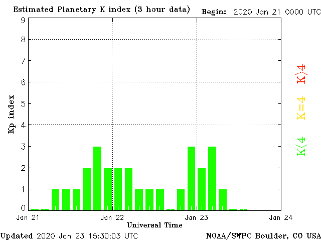 Geomagnetic activity is somewhat unstable, ranging from 0 to 3 of the Kp Index. The solar wind intensity has continued to be moderately potent, as expected. The geomagnetic field has adjusted well, with only minor geomagnetic upticks. A secondary solar wind density spike will impact tomorrow, but this is not expected to produce major storms. On the 27th, a much stronger solar wind stream will make contact with the earth, which could produce stronger geomagnetic disturbances.