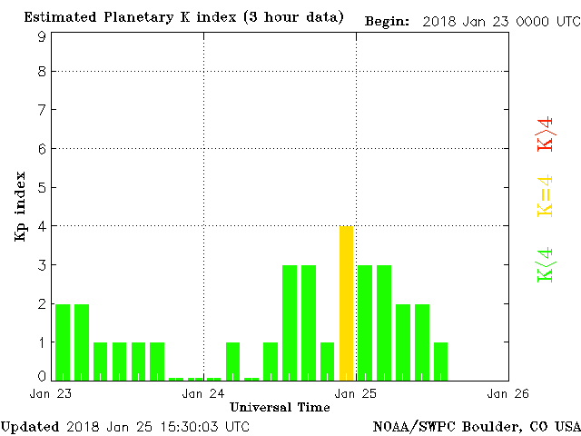 Geomagnetic conditions are stabilizing after a minor plasma penetration event due to a magnetic field reversal, ranging from 1 to 2 KP index. The coronal-hole that is presently earth-facing will likely interact with the geomagnetic field in several days.