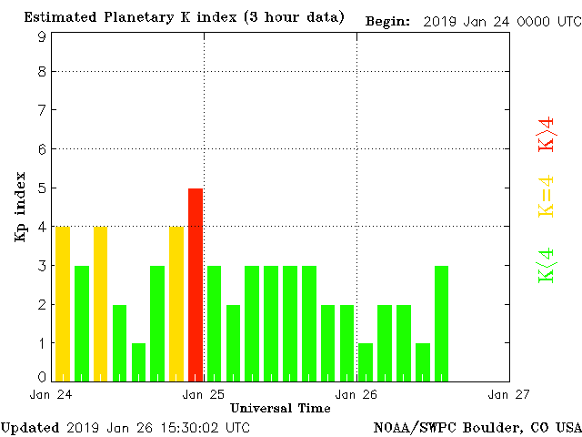 Geomagnetic activity is somewhat unstable, ranging from 1 to 3 of the Kp Index. The solar wind intensity began returning normal conditions last night, but only for now, as a second coronal hole stream is expected to impact in the next 48 hours. The geomagnetic field is likely to continue calming down until the next coronal hole stream arrives.