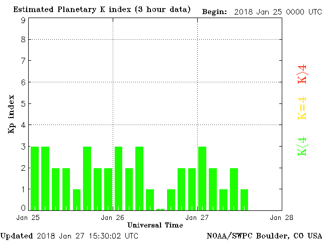 Geomagnetic conditions are mostly stable, ranging from 1 to 3 of the KP index. The next earth-facing coronal-hole is expected to impact the geomagnetic field sometime tomorrow afternoon, at which point, conditions could shift to moderate.