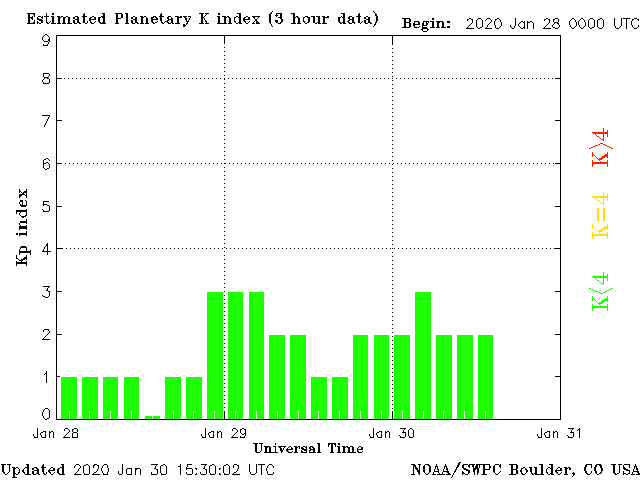 Geomagnetic activity is somewhat unstable, ranging from 2 to 3 of the Kp Index. The solar wind intensity continues to rise moderately as expected, causing minor geomagnetic disturbances. The stronger coronal-hole stream will continue to bath the earth till the 2nd of February. If the solar wind stream remains constant, despite the uptick in intensity, the geomagnetic field should stabilize over the next 36 hours or so.