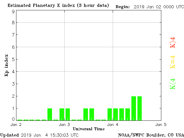 Geomagnetic activity is stable, ranging from 1 to 2 of the Kp Index. Solar wind intensity spiked a bit due to the expected coronal hole stream impact. No major geomagnetic storms expected today or tomorrow. Another coronal hole stream is expected to impact the earth in the next 24 to 48 hours.