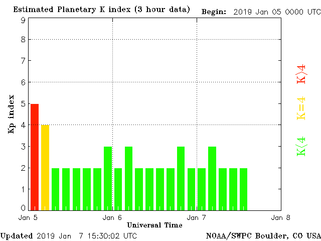 Geomagnetic activity is somewhat unstable, ranging from 2 to 3 of the Kp Index. Solar wind intensity is strong but density is weak allowing the geomagnetic field to remain fairly stable.The next earth-facing coronal hole stream will begin interacting with the geomagnetic field later this week.