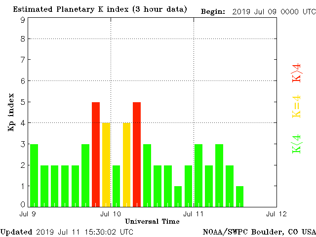 Geomagnetic activity is stabilizing, ranging from 1 to 3 of the Kp Index. The solar wind spiked yesterday morning, causing brief minor geomagnetic storms. The next solar-wind stream isn’t expected to impact until the end of the weekend.