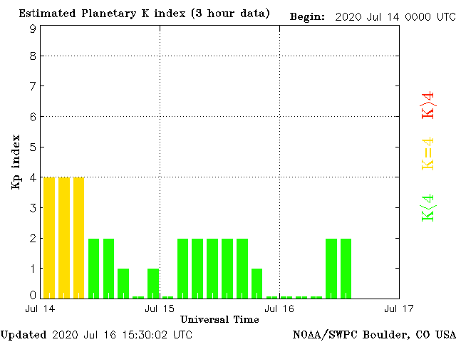 Geomagnetic activity is somewhat unstable, ranging from 0 to 3 of the Kp Index. The solar wind is moderately intense. The present intensification will trend down after a 3 day period of stronger flow. At the heels of this period, a density spike should arrive tomorrow, which could result in another minor geomagnetic storm event, similar to what occurred on the 14th.