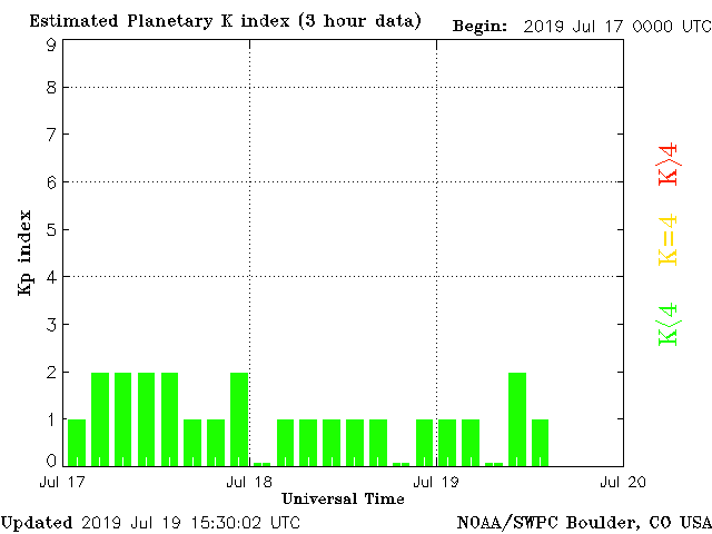 Geomagnetic activity is stable, ranging from 0 to 2 of the Kp Index. The solar wind intensity is continuing to calm. The expected coronal-hole stream impact weakened, expected to make contact early tomorrow morning but with little effect. The next coronal-hole stream is much more intense and is predicted to impact the earth on the 22nd or thereabouts,