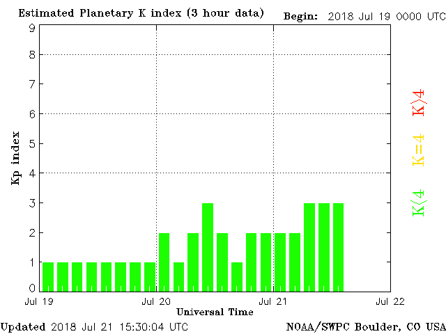 Geomagnetic activity is stable for the time being, steady at 1 of the Kp Index. Solar wind intensity is intensifying as the coronal-hole stream impacts the earth. There is a chance of geomagnetic uptick as the solar wind intensifies throughout the next day. A second coronal-hole is right behind the departing one, which could cause minor geomagnetic storms over the next two days.