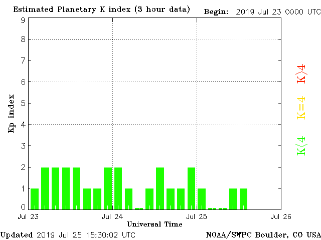 Geomagnetic activity is stable, ranging from 0 to 1 of the Kp Index. The solar wind intensity is calm. Starting today, 3 seperate coronal-hole streams will impact the earth, one on each successive day, leading up to the 27th. These streams appear weak and are not expected to produce strong geomagnetic storms. However, an overlap of interaction might cause greater disturbances than their individual streams would normal trigger.