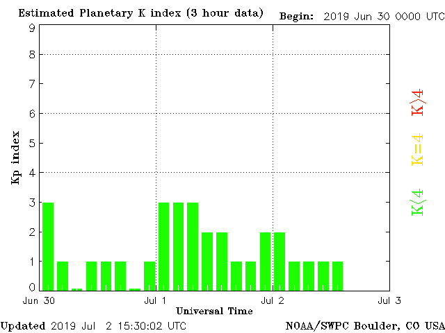 Geomagnetic activity is stable, ranging from 1 to 2 of the Kp Index. The solar wind intensity is trending downward. The next solar-wind stream is expected this weekend, with a small chance of causing major storms.