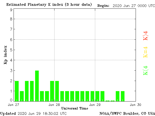 Geomagnetic activity is stable, ranging from 0 to 1 of the Kp Index. The solar wind intensity spiked briefly this morning, due to an expected rise in solar wind density. This caused a minor uptick of the geomagnetic field, which will likely remain calm throughout the day.