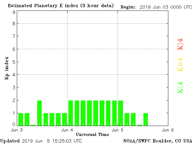 Geomagnetic activity is stable, ranging from 0 to 1 of the Kp Index. The solar wind intensity is returning to normal but still a bit erratic. The next earth-facing coronal-hole stream will interact with the earth in several days.