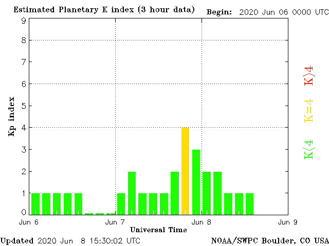 Geomagnetic activity is now stable, ranging from 1 to 3 of the Kp Index. The solar wind intensity rose sharply along with a spike in temperature that caused a minor geomagnetic storm event last night. An uptick in solar wind intensity should arrive on the 12th or so. Calm conditions are likely until them.