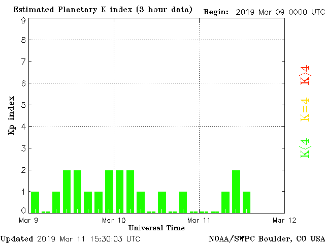 Geomagnetic activity is stable, ranging from 0 to 2 of the Kp Index. The solar wind intensity is normal. Geomagnetic storms are not expected until the next earth-facing coronal-hole swings into position in several days.
