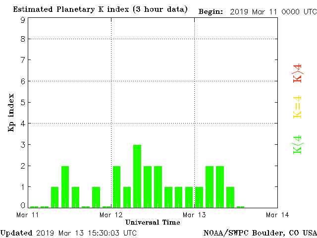 Geomagnetic activity is stable, ranging from 0 to 2 of the Kp Index. The solar wind intensity is normal. Geomagnetic storms are not expected until the next earth-facing coronal-hole swings into position in several days.